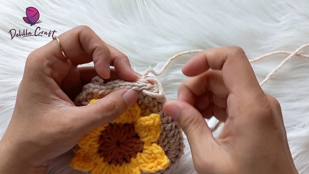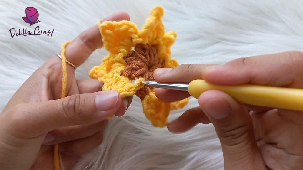 - Insert the hook into any chain space and attach yellow yarn.
