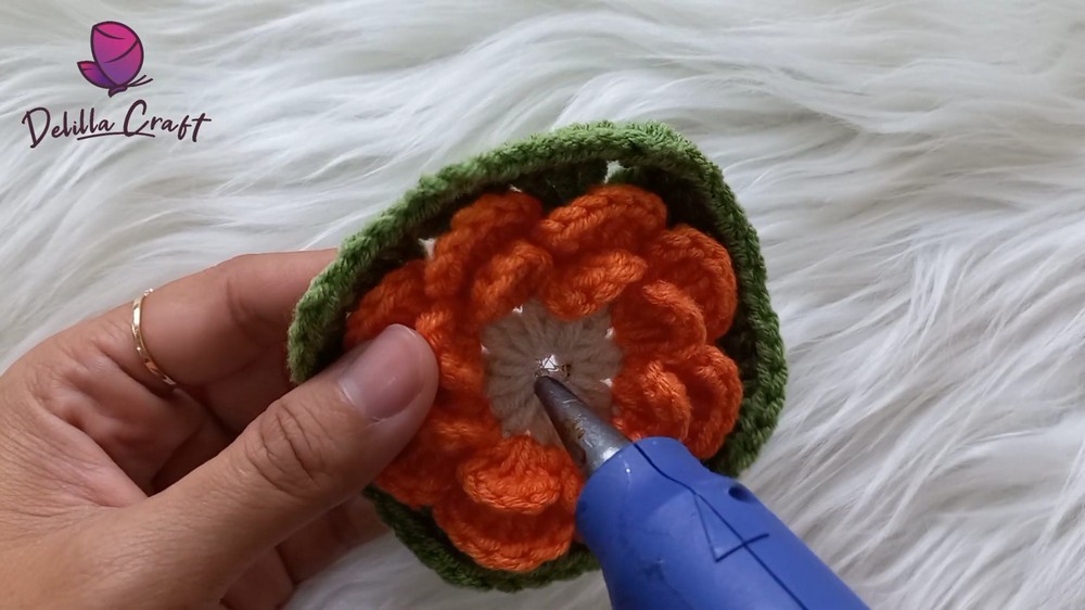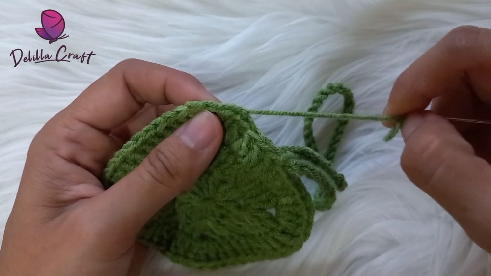 - Work from the front again by making slip stitch, 2 chains, 5 DCs, 2 chains in each space. Repeat until you create 8 petals.