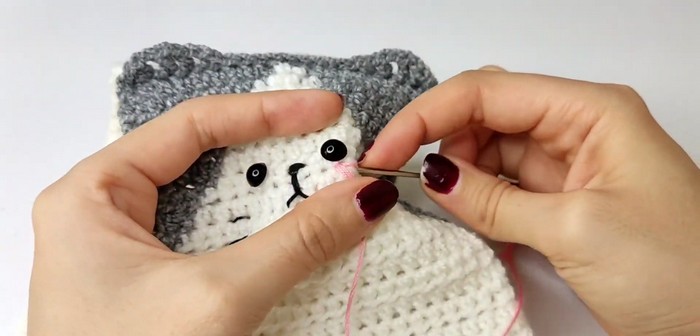 - Use needle and thread to sew the nose and mouth and cheeks.