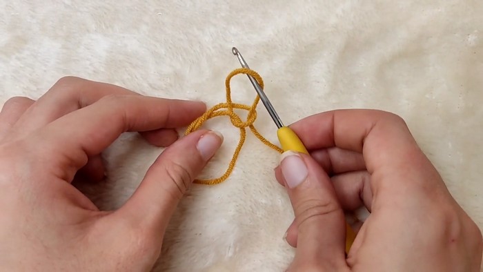 - YO twice, insert hook into the magic ring, YO, pull through the ring (4 loops on hook).
