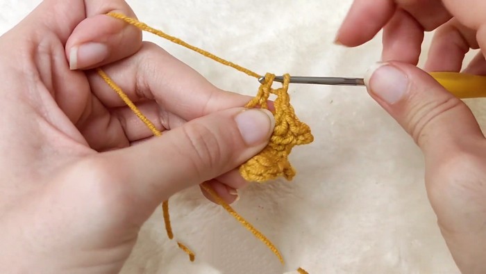 - Crochet 2 DCs, 1 TC, and 1 DC into the magic ring.