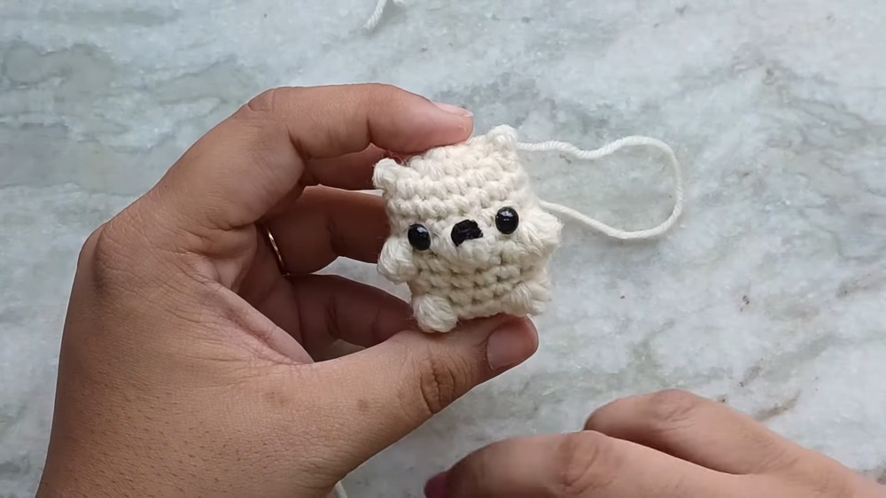 - Add small beige ears by slip stitching into the designated stitch above the safety eyes. Chain 2, slip stitch back, and fasten off.