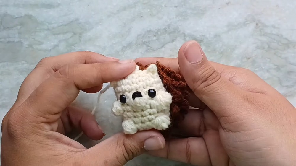 - Align the brown spiked section to the beige body. Use a yarn tail to securely sew the pieces together.