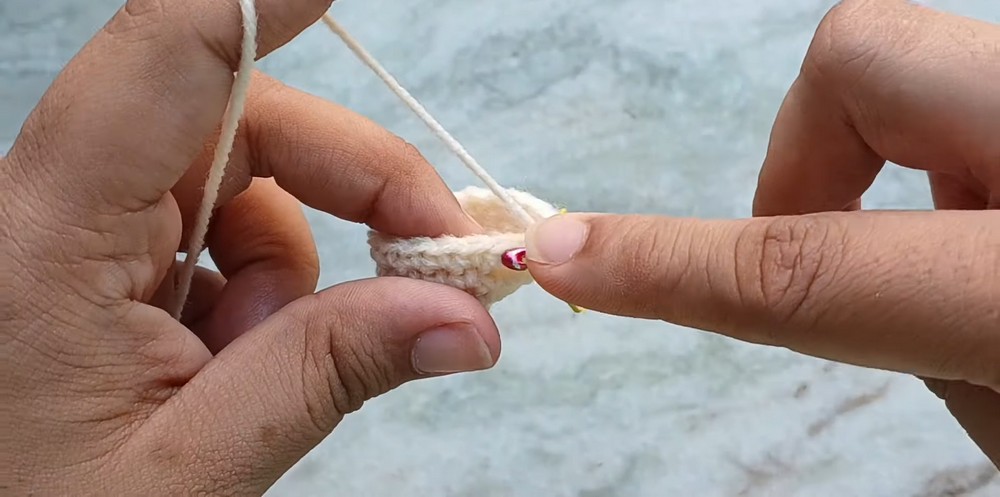 - Fasten off and leave a long tail. Weave the tail through the front loops of the last round to close the hole securely.