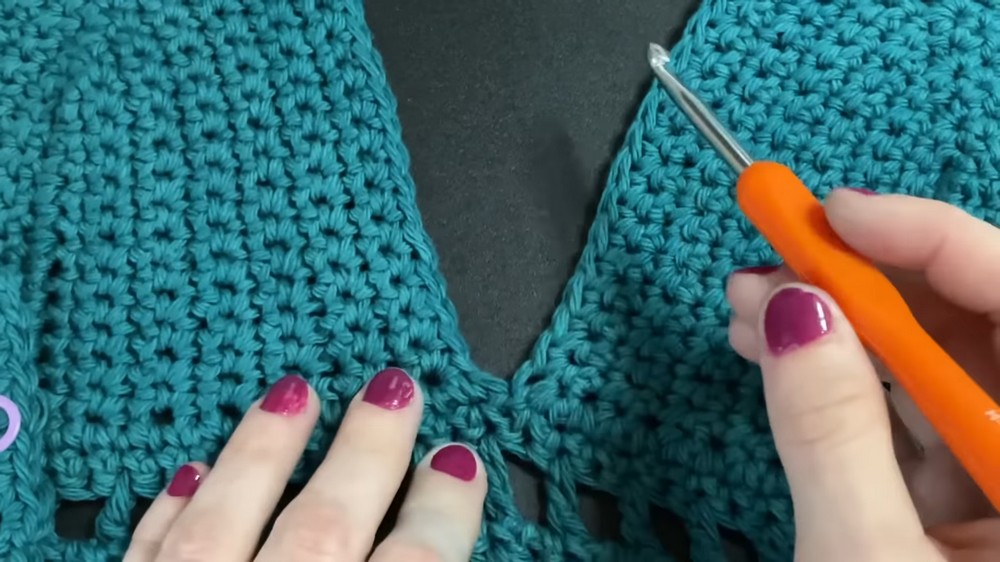 - Continue repeating rows of dc stitches until you have a rectangle that covers half of your bust (adjust the number of rows based on desired coverage).