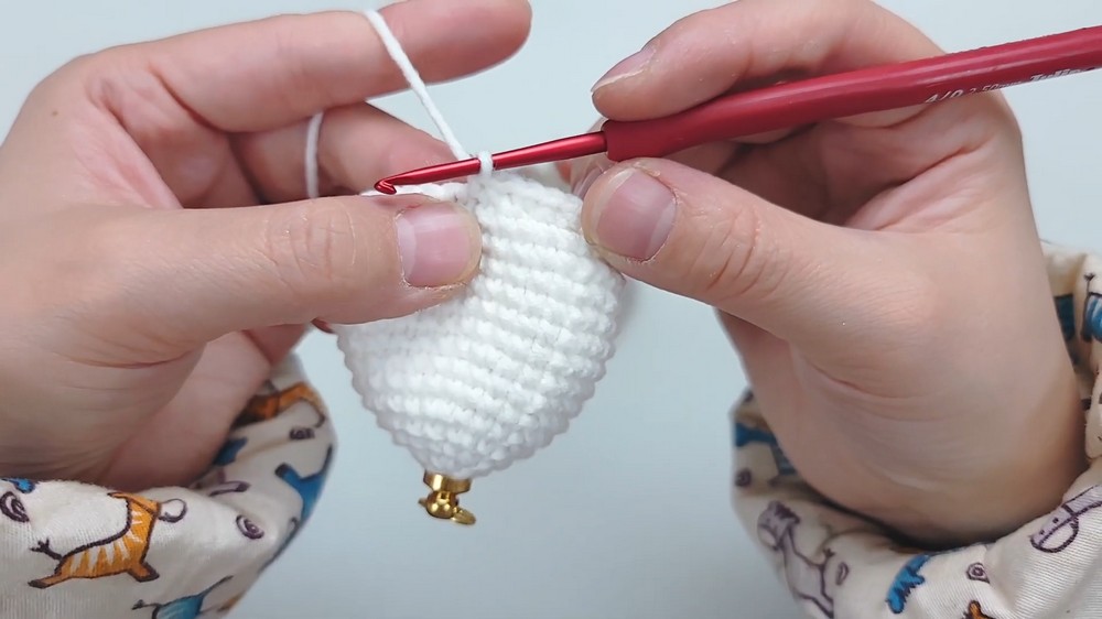- Crochet (1 SC followed by 1 SC decrease stitch) for all stitches. Total stitches result in 12 SC. Finish the head by cutting the yarn, leaving a long end for sewing.