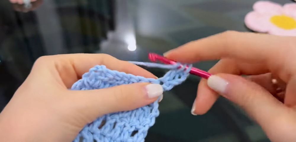 - Make 3 double crochet stitches into each row of the top’s edge to create the skirt base.