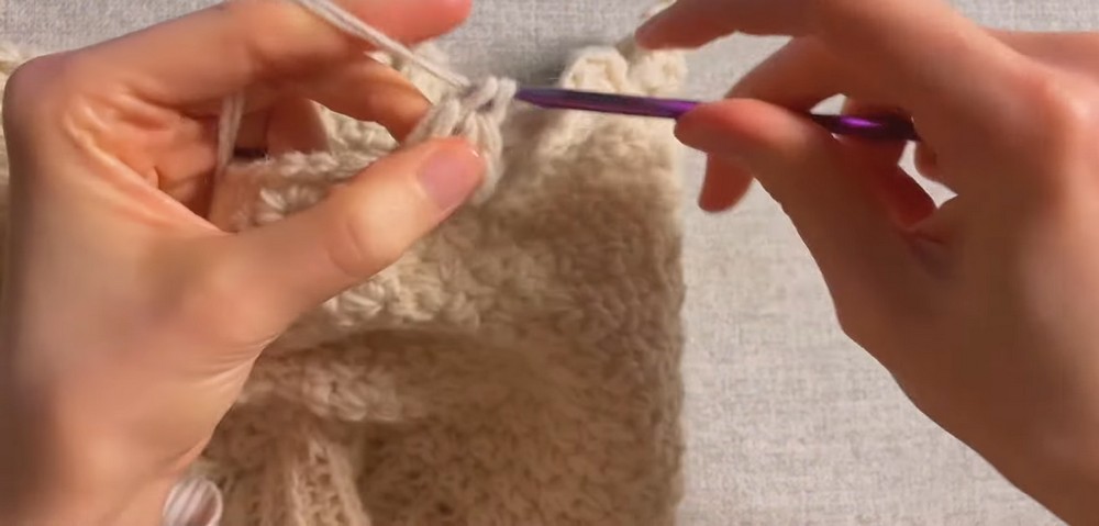 - Insert the hook beneath two strands of the stitch and crochet single crochet normally.