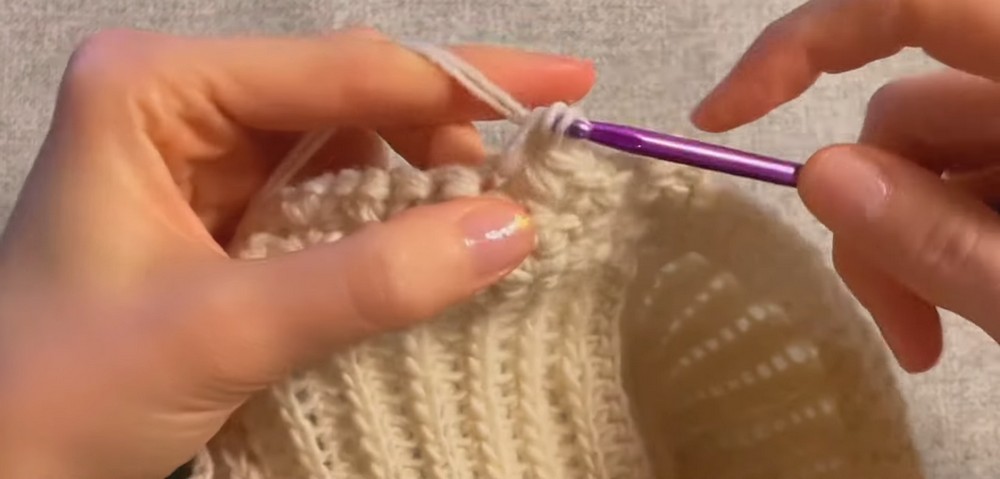 - Insert your hook near the seam of the ribbed band, pull up the yarn, and begin with a single crochet stitch.