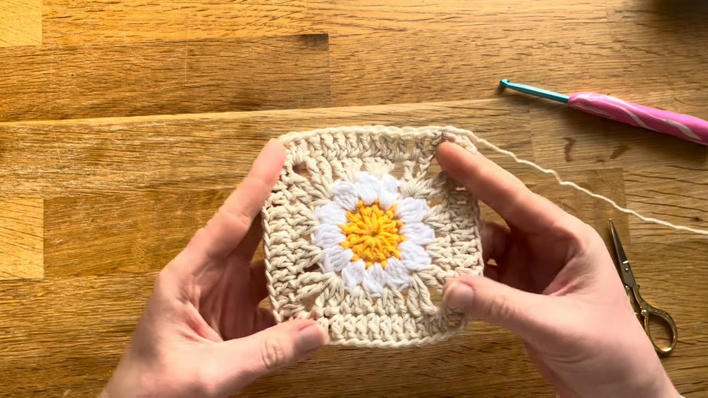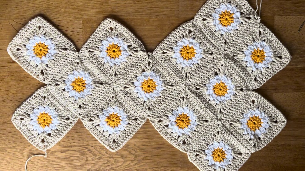 - The complete tote bag consists of 13 daisy granny squares, blocking and stitching them together into the described layout. Dimensions depend on gauge and the exact squares' size after blocking.