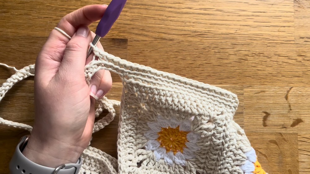 - Chain 55 for each handle (or 120 for cross-body). Skip adjacent stitches and secure straps by single crocheting into opposite corners.
