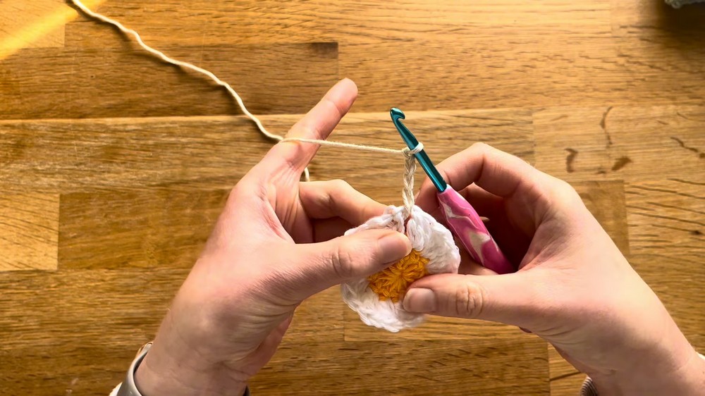 - Attach the outer color yarn to a chain-1 space between any petals.