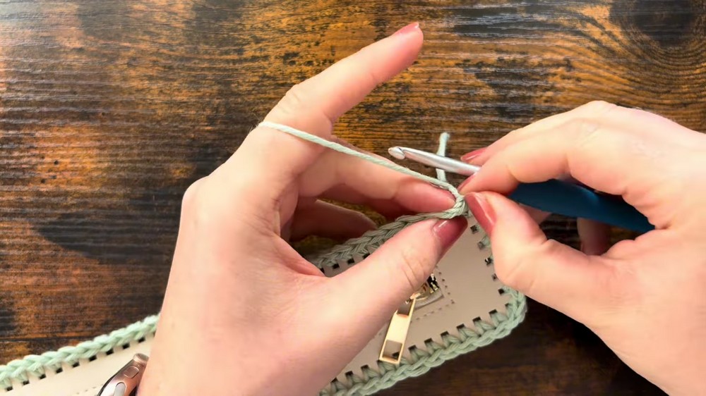 - Fasten off: Leave a long tail to sew the zipper to your pouch later.