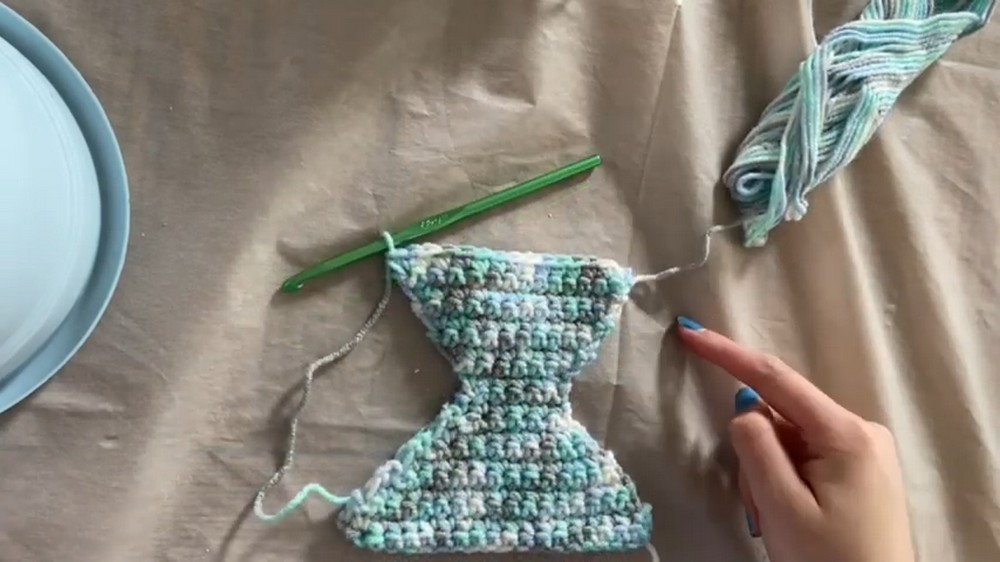 - Chain 25 stitches, then SC across for 24 stitches per row. Complete 2 rows for a thin handle.