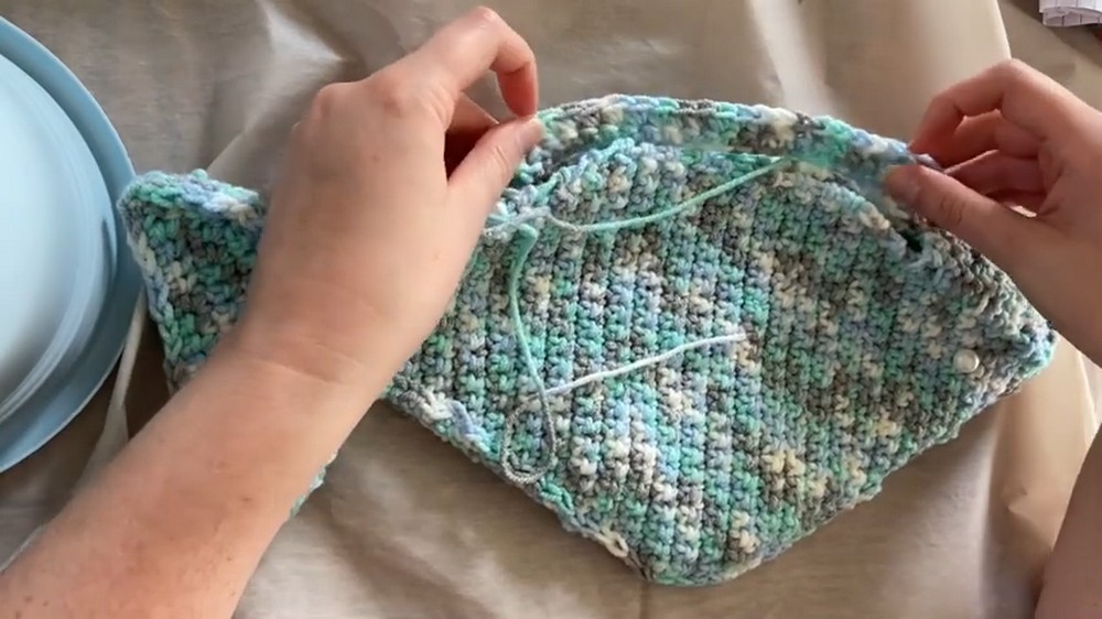 - Use the tail ends of the yarn to sew each side of the handle to the top flat edge of the fish bag.