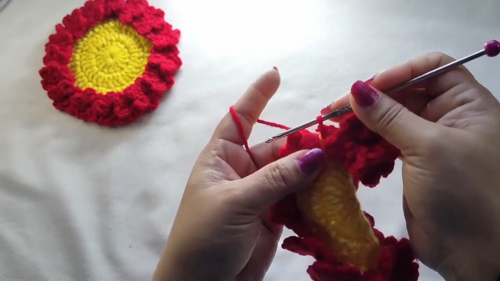 - Join your flower color yarn by pulling it through any stitch of the base circle.