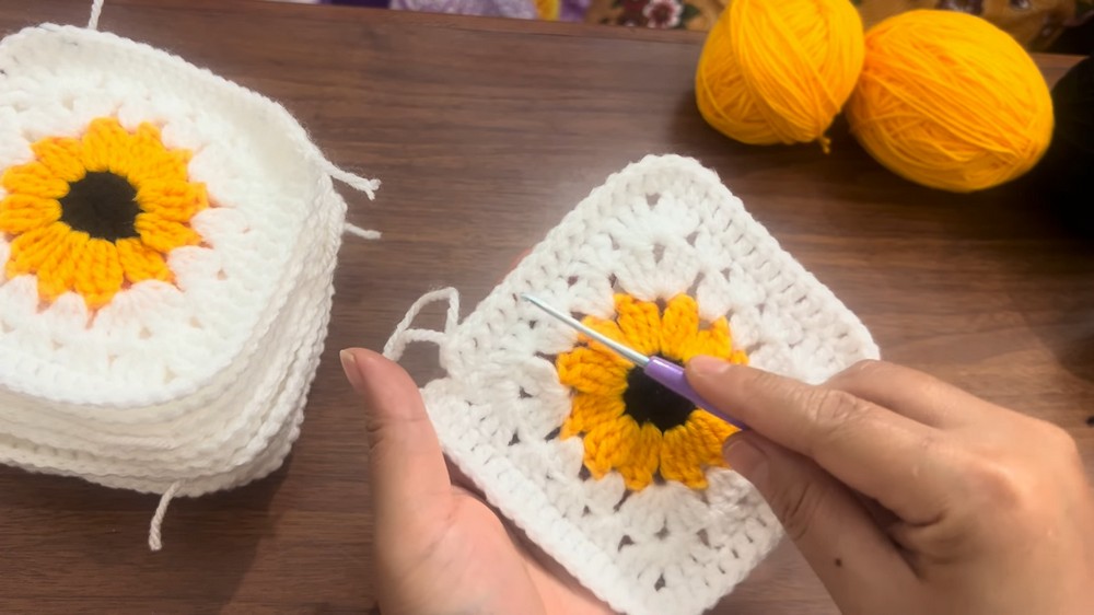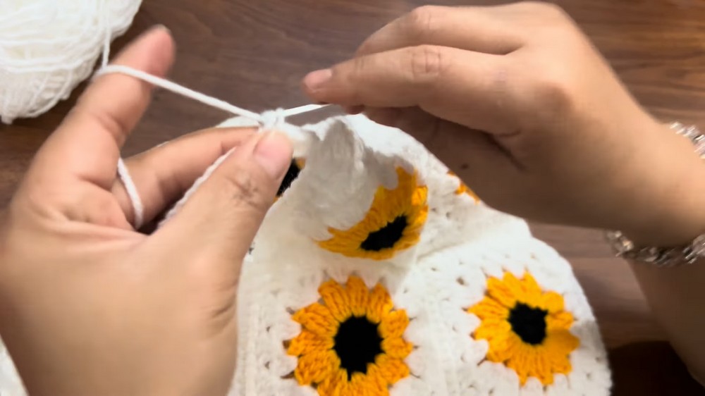 - Using the last color of your squares (e.g., white), join the yarn to the corner of both squares.