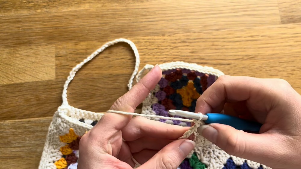 - Work back loop sc into each handle chain and around the bag for reinforcement.