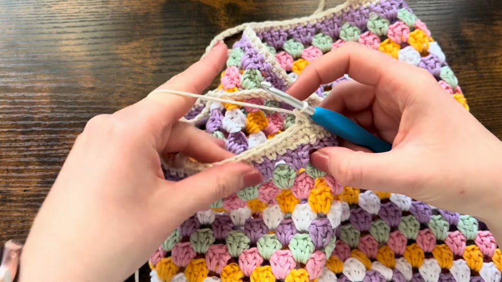 - Work 1 sc into each st around the top edge of the bag.