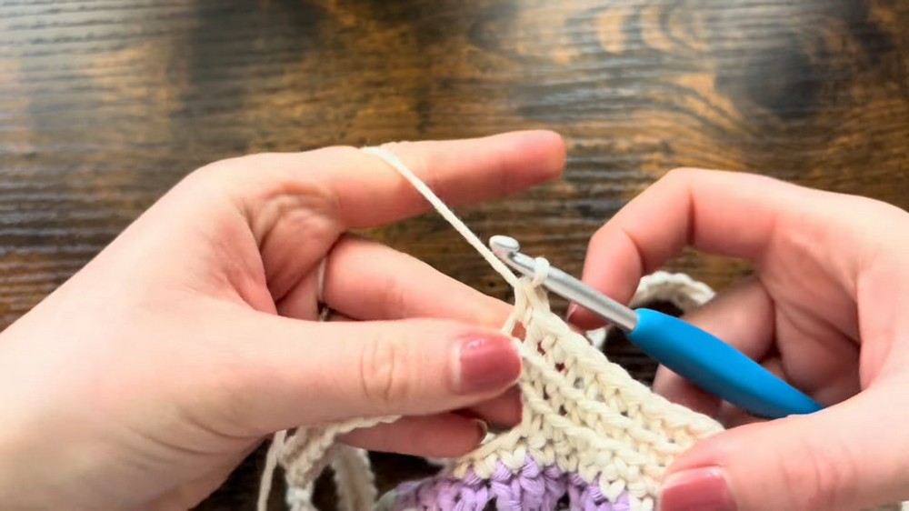 - Chain for the handle: Ch 55, then sk 23 sts, and join with an sc into the 24th st.