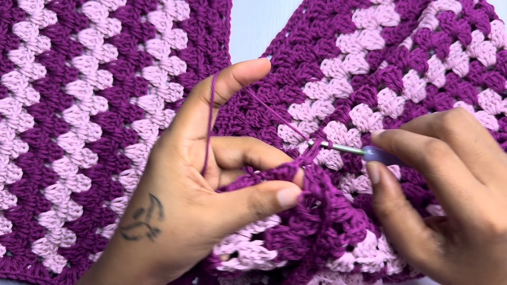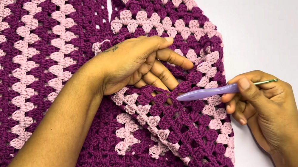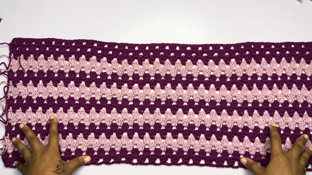 - Repeat the granny stitch rows until your panel width matches half of your bust measurement.