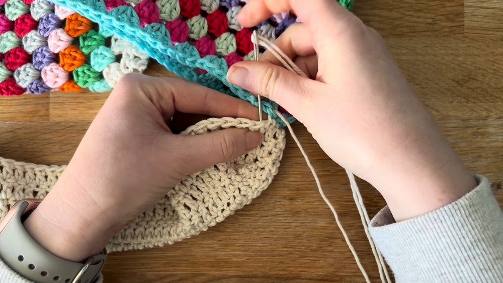 - Fasten off the current color and join a new yarn to one of the spaces between granny clusters.