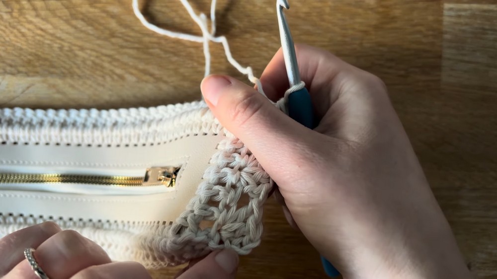 - After completing the single crochet stitches around the zipper, join with a sl st into the first stitch.