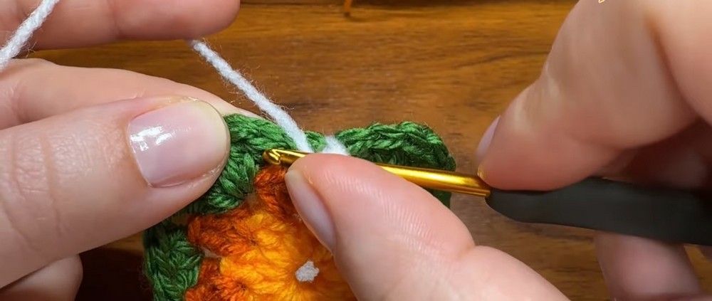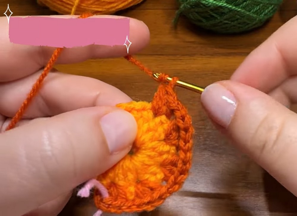 - Instead of working into the next 3 stitches on top, go back down to Round 2 and place 3 dc between two orange groups.