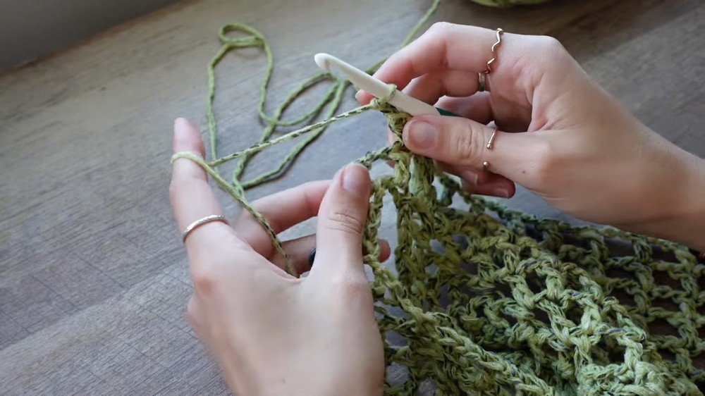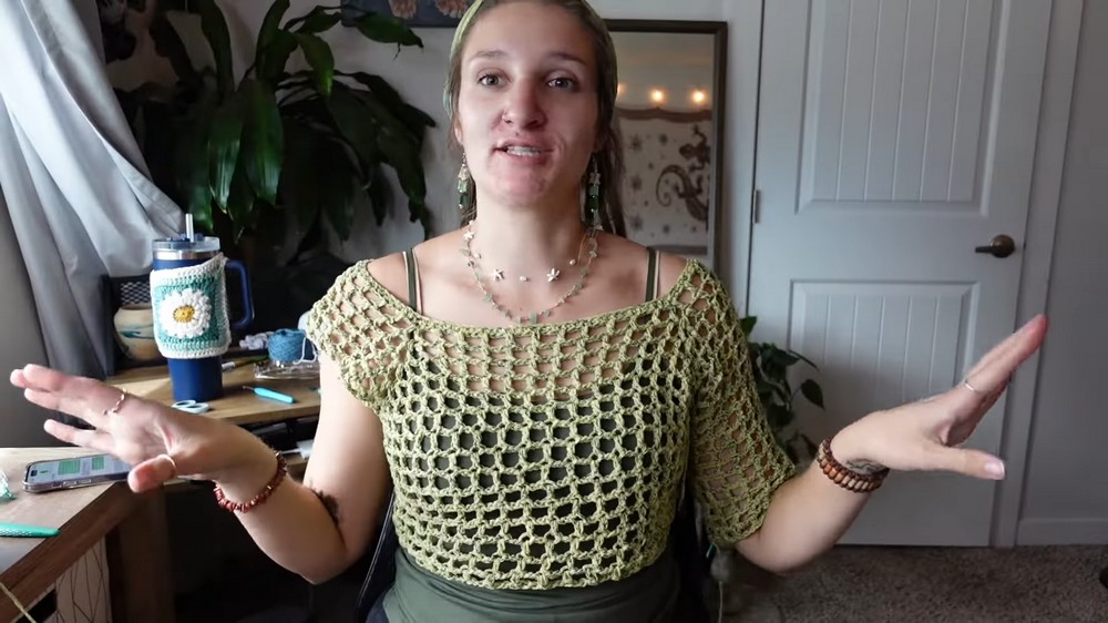 - Use a hook size larger than the recommended size for your yarn to create a flowy mesh look. Kayla used a size 7 hook for a looser and lacier fit.