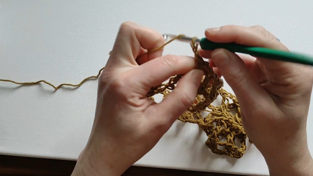 - Continue with the mesh pattern (extended double crochet, chain 2).