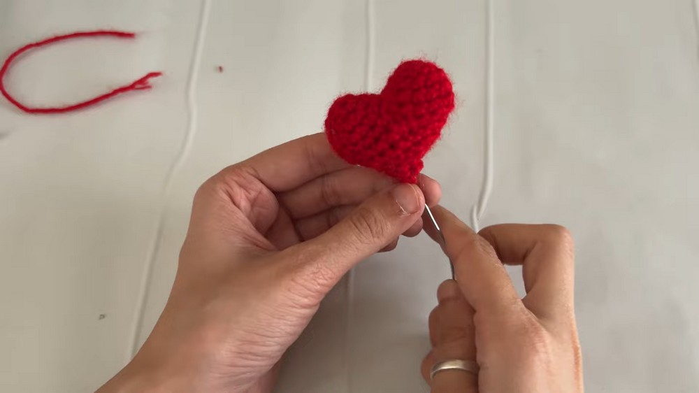 - Fasten off, leaving a long tail for sewing. Insert stuffing into the heart before fully closing.