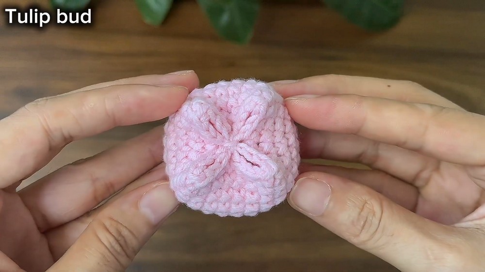 - Fasten off, leaving a long tail for sewing. Stuff the tulip bud with cotton for shaping.