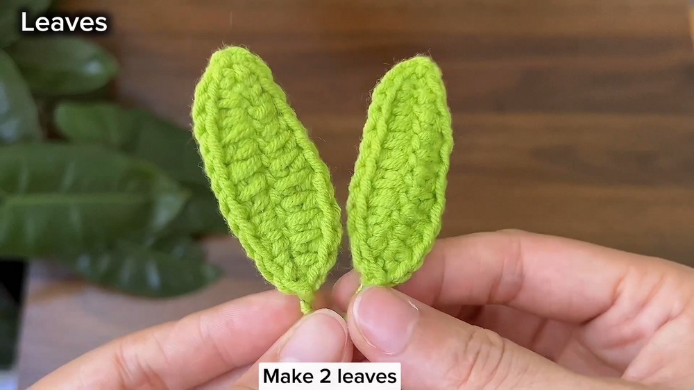 - Fasten off and leave yarn tails to wrap around or attach the leaf.