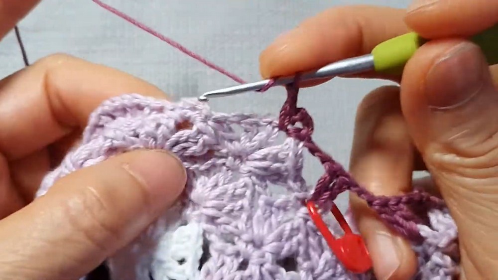 - Work the shell pattern (6 dc shells separated by sc+ch combinations) in rounds.