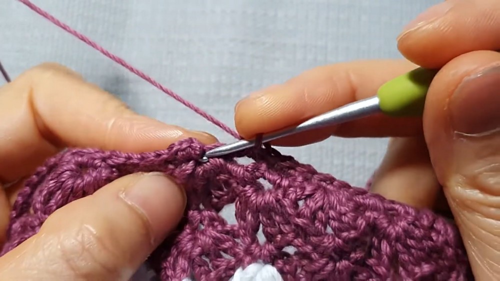 - Start with ch 4 (counts as the first dc), then work dc + ch 1 + dc into the next loop.