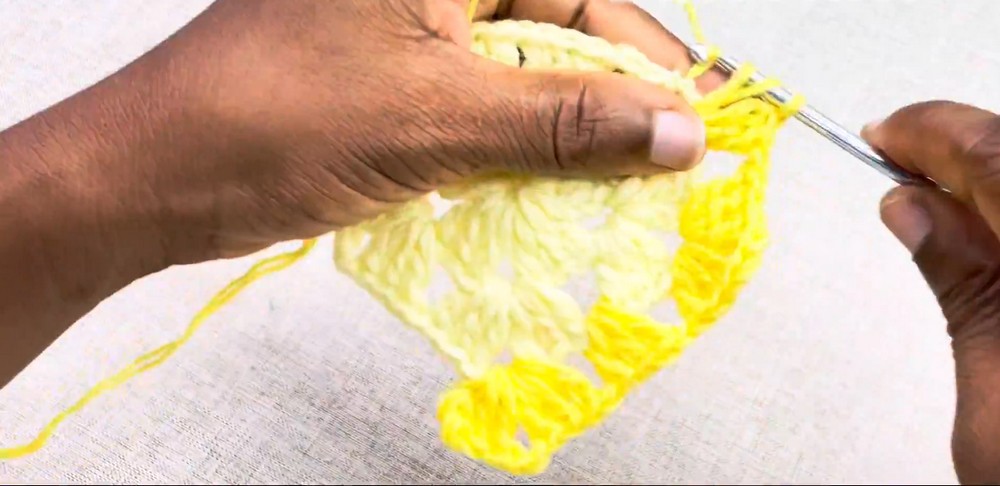 - Make 2 double crochets, chain 2, and 3 more double crochets (corner space pattern).