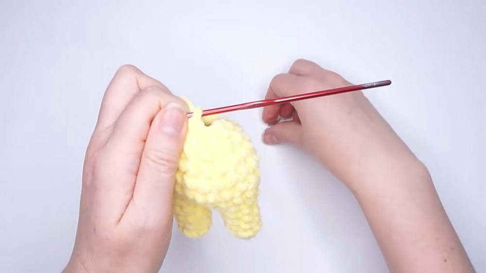- Row 14: Attach the paws at this point, crocheting [2 sc, 3 sc along the paw and body, 3 sc along the body, 3 sc along paw and body, 1 sc]. Maintain 12 sc.