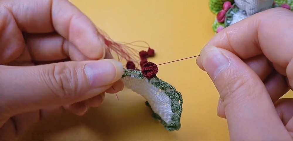 - Yarn: Size 80 lace thread in dark red, green, and white