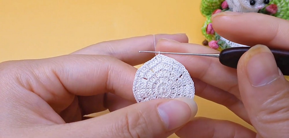 - Chain 4, slant insert into the 3rd dc of the last round, single crochet to anchor.