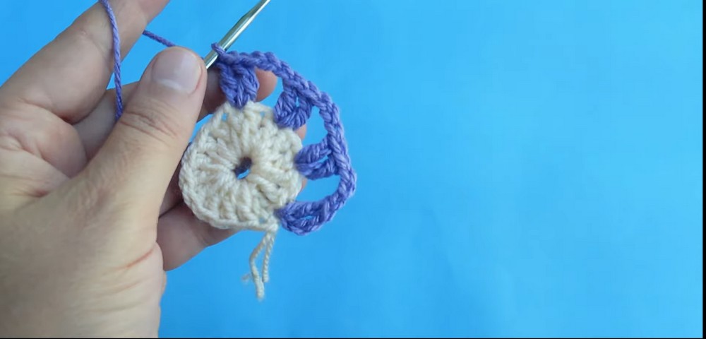 - Chain 3, insert your hook into the middle of the 3-double crochet group from this step, and work a slip stitch. This creates a small picot-like loop.