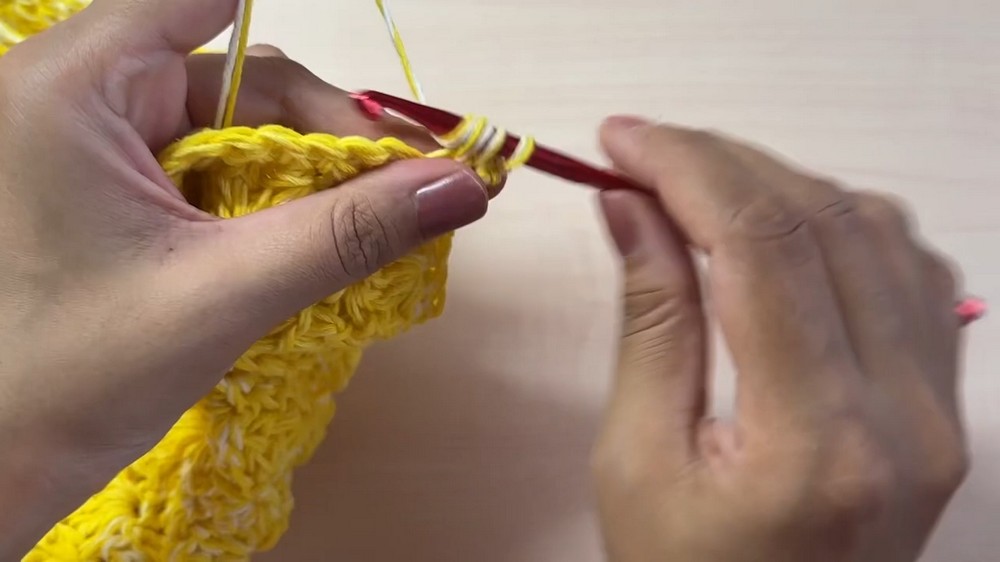 - Repeat the pattern: skip two stitches, make 5 double crochets, skip two stitches, make a single crochet.
