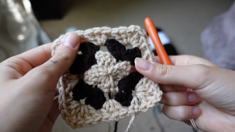 - Place the granny square where you want the pocket to be on the shorts.