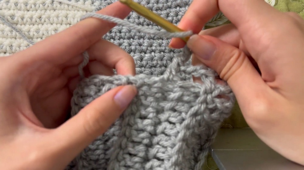 - Skip 2 stitches and dc into the in-between space of the rows.