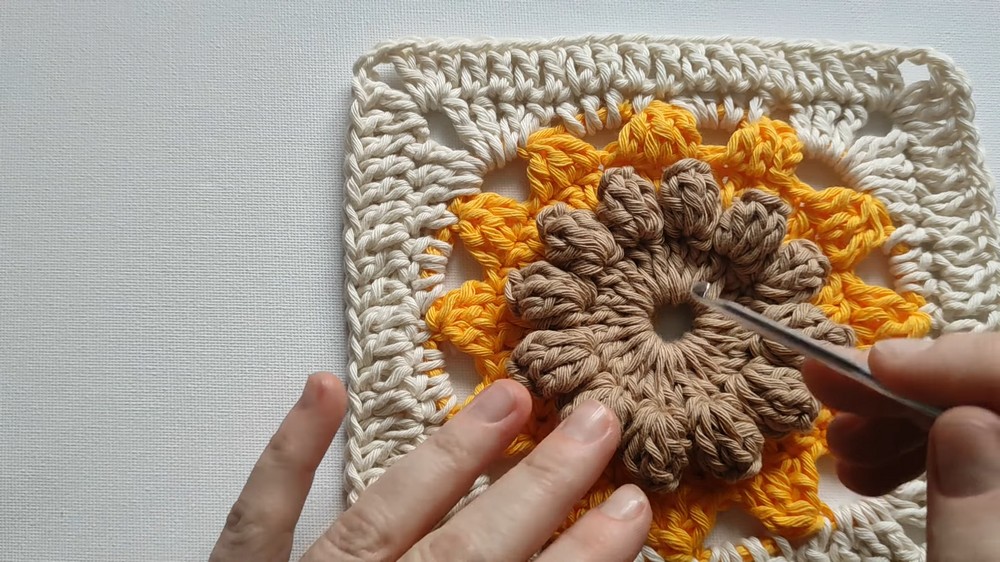 - Work 5 dc into the next stitch and complete another popcorn stitch.