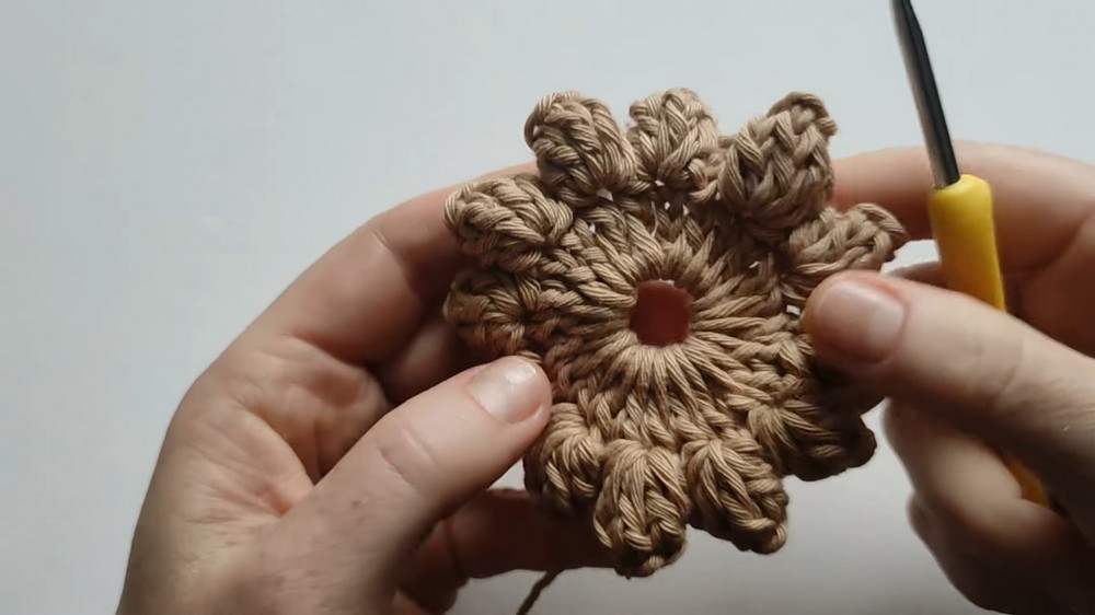 - Repeat the popcorn process (skip 1 stitch, make 5 dc, chain 2) until the round is complete.