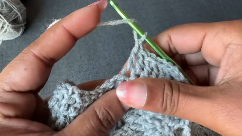 - Continue the pattern until the end, leaving 2 chains at the end. Place 1 dc in the last chain.