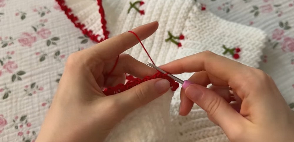 - Use red yarn to create small cross-stitches for cherries. Carefully shape each cross to ensure uniform size.