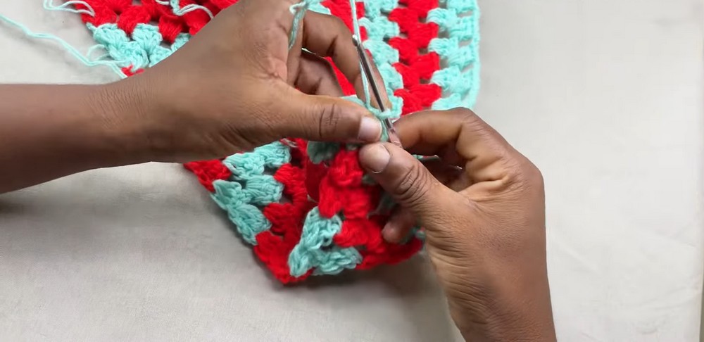 - Chain 2, then make 6 double crochets into the chain-2 corner space (3 DC, chain 2, 3 DC = corner fan stitch).