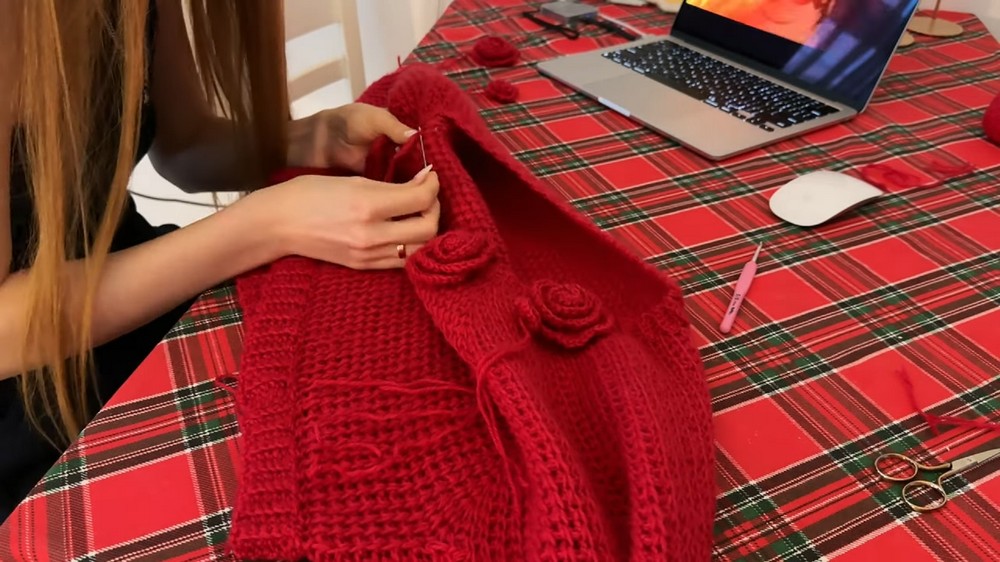 The design stands out with its top-down construction, non-sewn features, and customizable rose appliqués. The blend of elegant crochet stitches, ribbed edges, and vibrant floral accents creates a balance between romantic and casual styles. Choose a red hue for bold Valentine vibes or classic white for a softer, timeless look. With its lightweight yet comfortable fit, this sweater combines artistry and wearability, making it ideal for any occasion while offering countless ways to personalize the design to your liking.