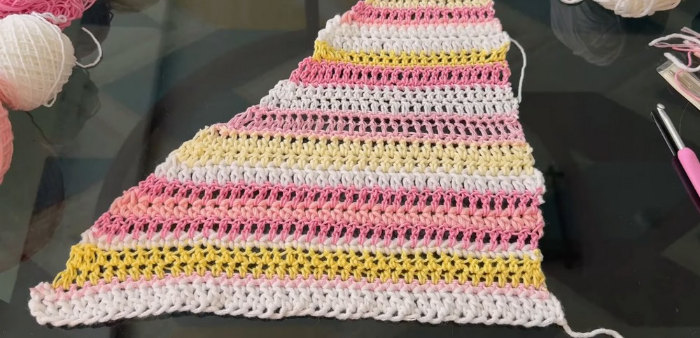 - Continue decreasing rows until the panel tapers to a point. This creates the diagonal wrap shape.